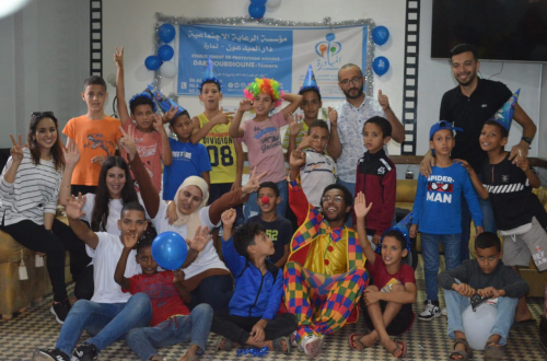 Dans le même cadre l'association TAWAF de Temara vient d'organiser une activité de clown pour les orphelins du centre de protection social "Dar Mobdioune", et ce pour partager avec eux une journée plein de bonheur, de joie pour les encourager et les motiver à prendre ce challenge de vie d'un point de vue positif et de se doter de courage pour persévérer et réussir.