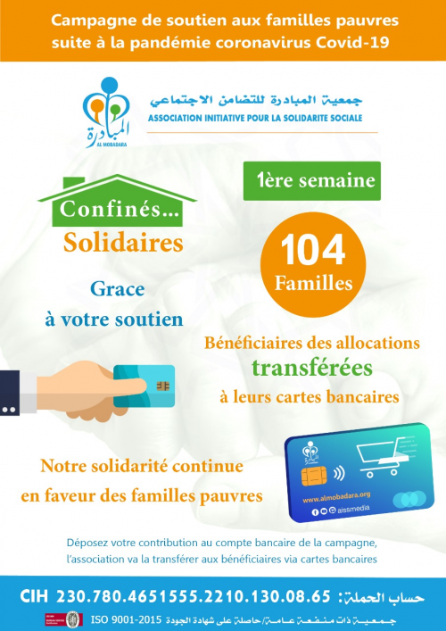 Après le lancement de la campagne de solidarité "Confinés Solidaire" par l'association Almobadara et grâce à la réactivité des marocains avec cette campagne nous avons pu parvenir à l'aide de 104 familles au cours de la première semaine de cette initiative pour minimiser les impacts sociaux du covid-19 en une semaine. Merci à vous pour votre engagement et soutien.