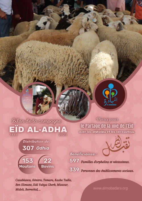 Après avoir organisé la campagne de solidarité de l'Aid el adha nommé "Soyons la raison de leurs sourires" qui avait pour but de fournir aux familles bénéficiaires un mouton pour l'occasion. Il nous a ainsi été possible d'offrir 153 moutons et 22 bovins. Ces aides ont directement été financés par vos dons qui ont permis aux familles des orphelins de passer une fête d'Adha convenable.